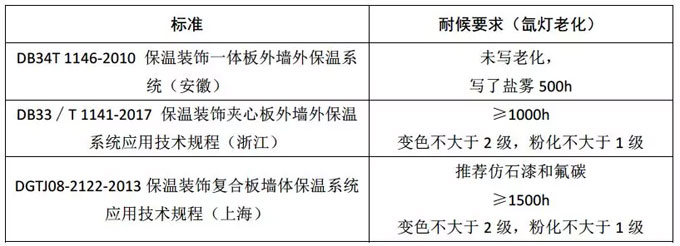 可以看出一體板的這些地方標(biāo)準(zhǔn),相對來說弱化或規(guī)避了涂層耐候性的指標(biāo),而且未明確不同涂層種類的差別,一刀切的規(guī)定大約在1000~1500h的耐候性。這個指標(biāo)很像多彩漆和氟碳漆的耐候性之間找了一個平衡點(diǎn),其實(shí)主要原因在于我們現(xiàn)在定標(biāo)準(zhǔn)很多時候必須平衡參與的多個廠家的建議和利益,因此指標(biāo)往往會折中處理。